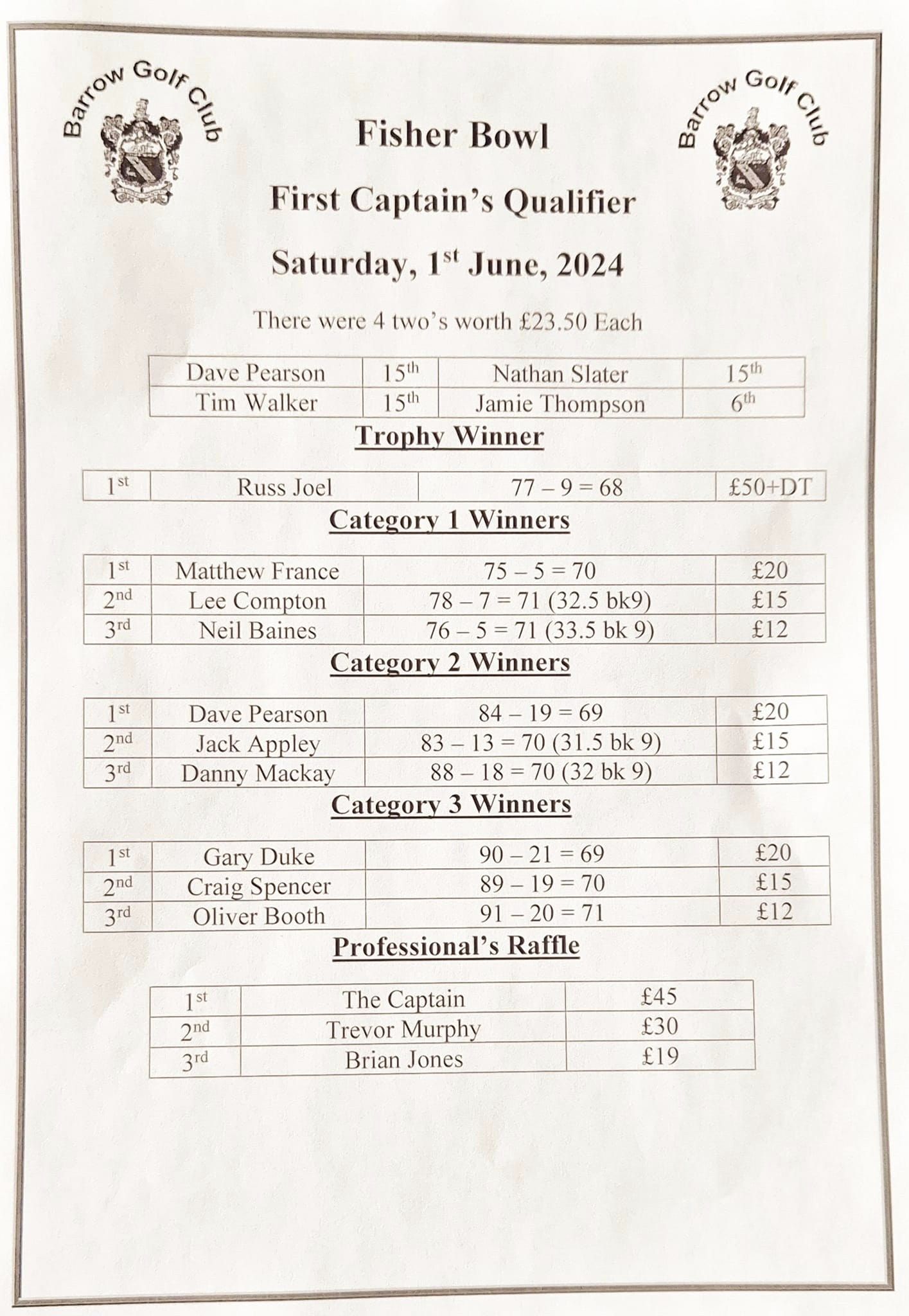 92 men played in the Fisher Bowl yesterday. The top 16 nett scores also qualified for the 1st Captain’s Knockout Trophy. The winner of the Fisher Bowl, in difficult conditions, was Russ Joel with a 77-9=68. Congratulations to the greens staff for getting the course in excellent condition after a really tough winter.